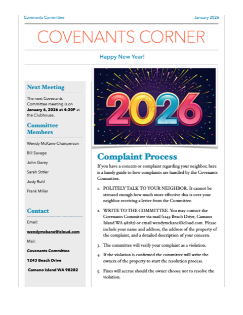 The Covenant Committee members meet monthly to review and discuss Camano Country Club Property Owners needs.